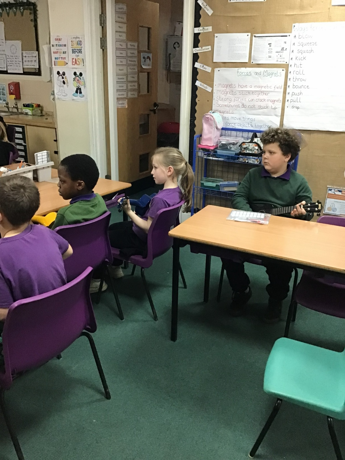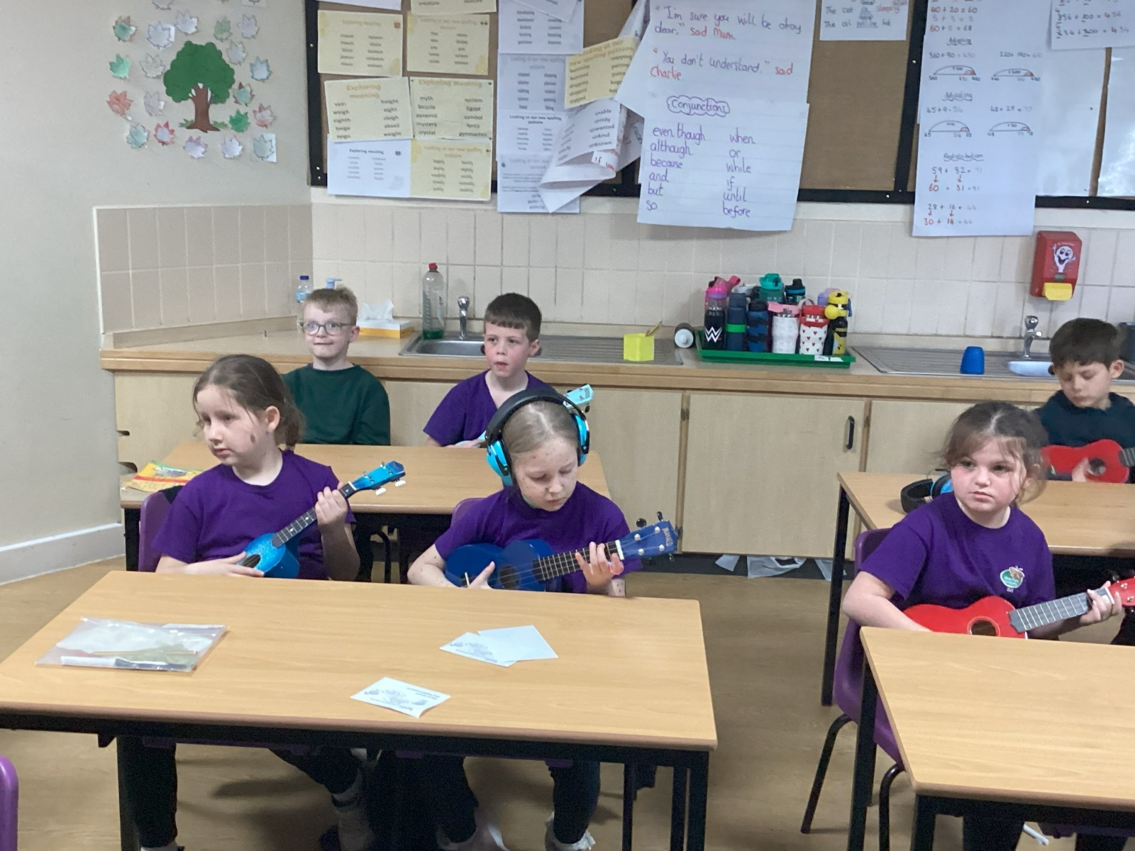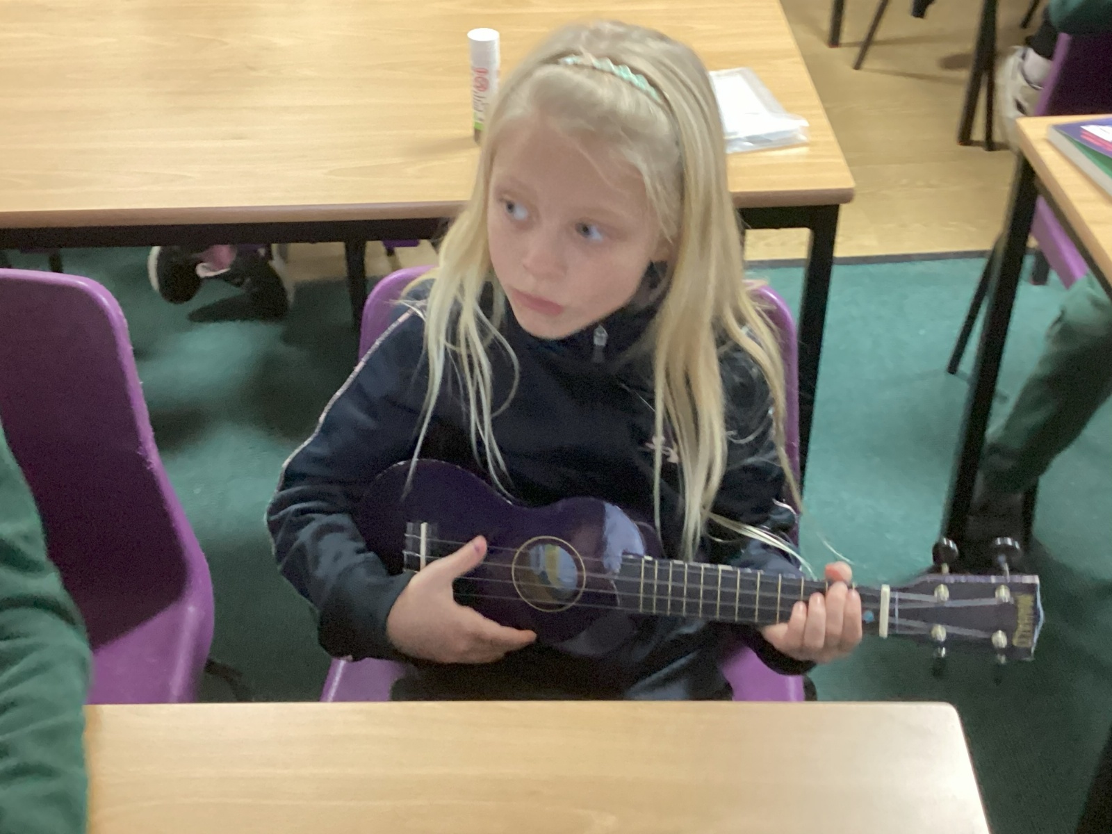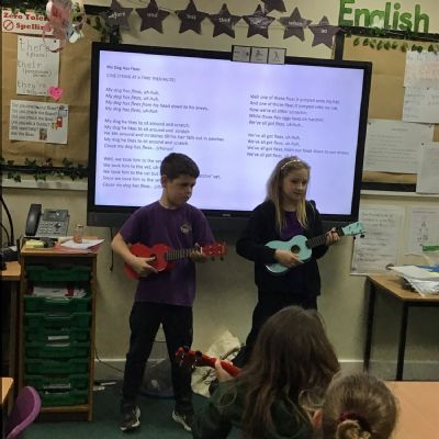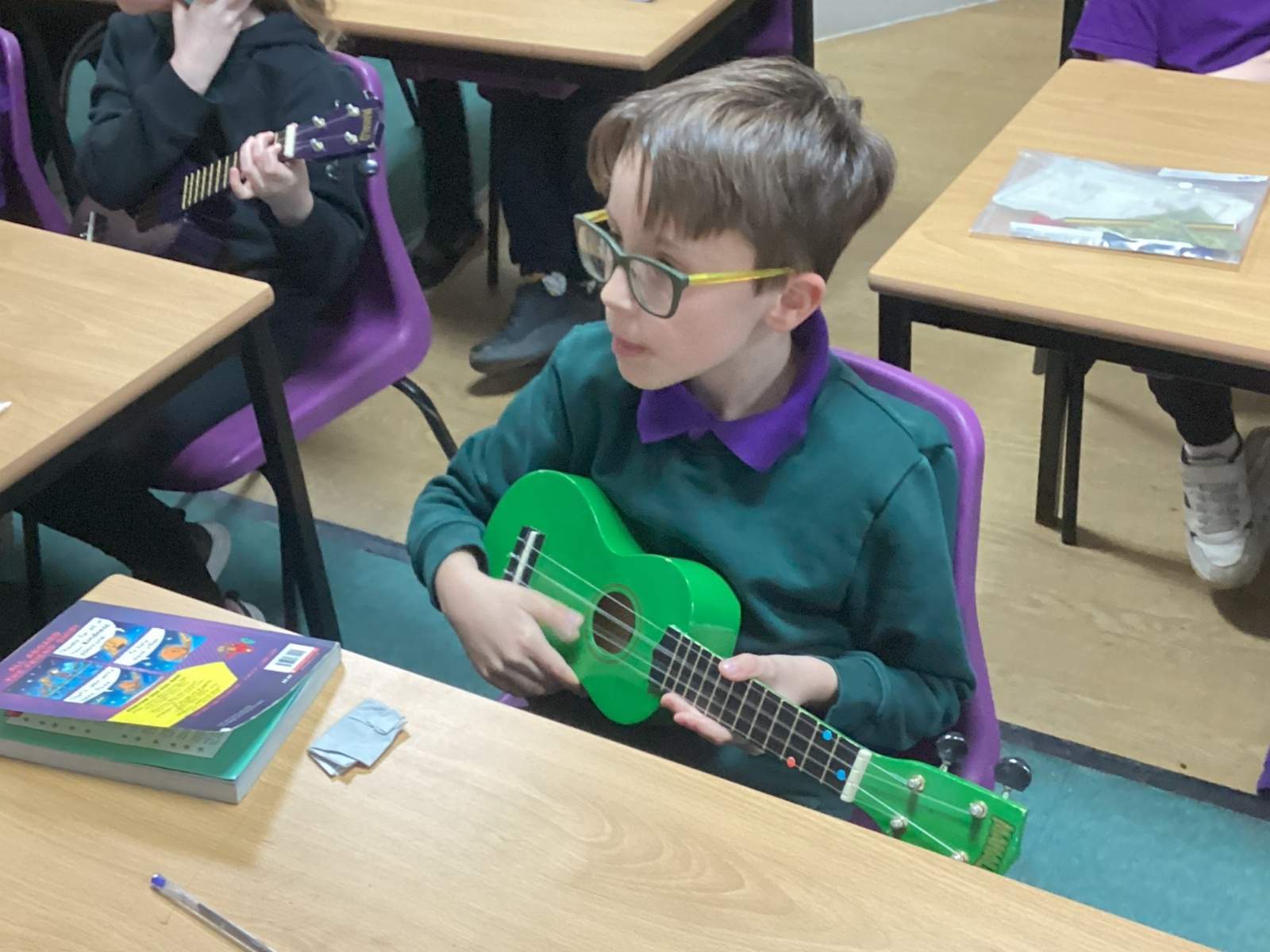 This term Year 3 have been learning to play the Ukulele. Mrs Guest from Durham Music service has been coming in once a week to teach the children. She has been very impressed with how much progress the children have made. They have learnt to play the chords C, F and Am and to play a variety of songs including Mama Mia and Hit the Road Jack. They also enjoyed signing as well as playing the ukulele.