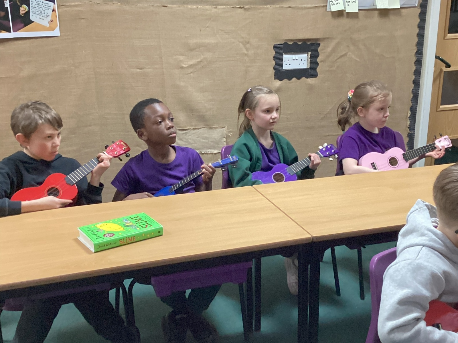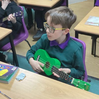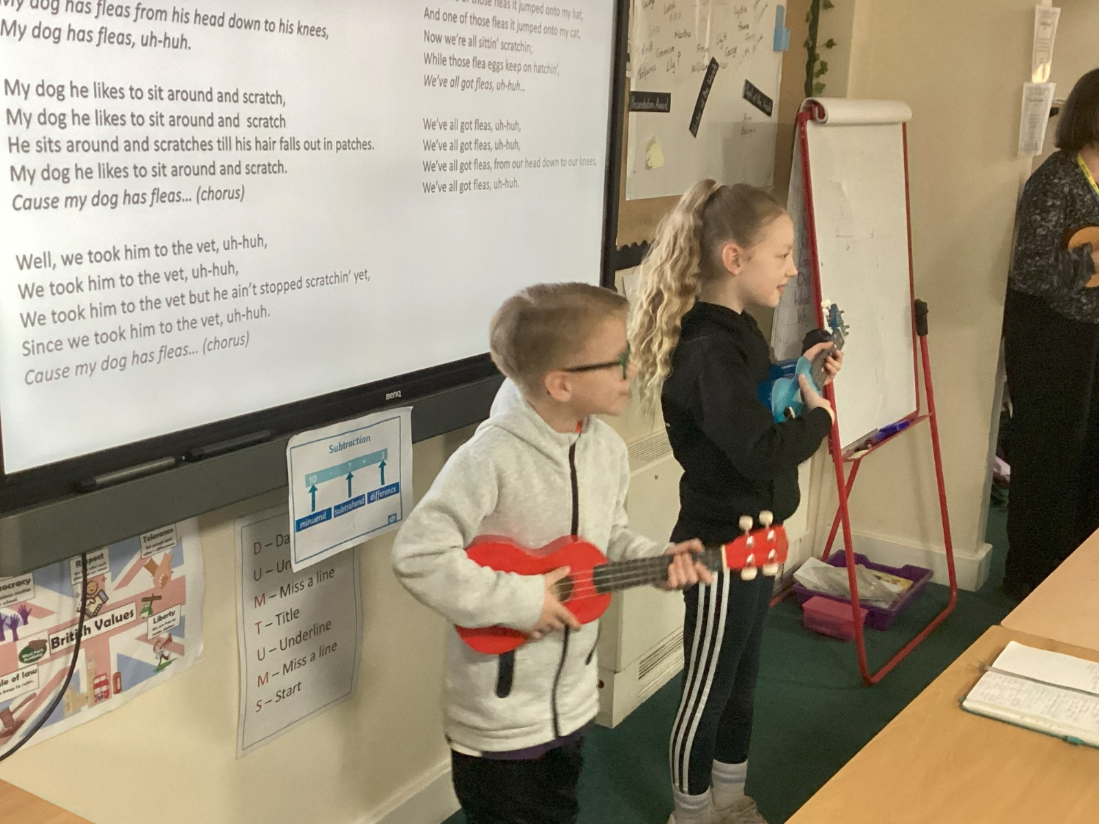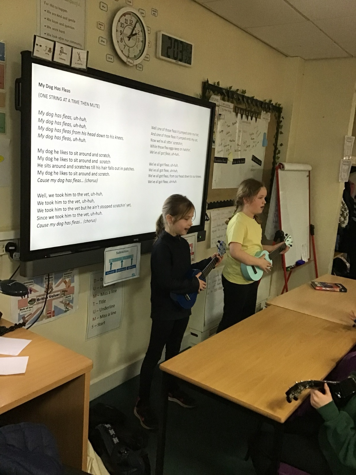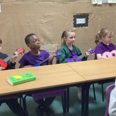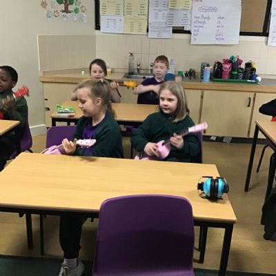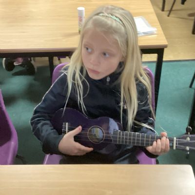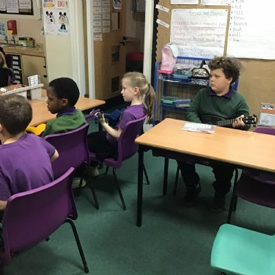 This term Year 3 have been learning to play the Ukulele. Mrs Guest from Durham Music service has been coming in once a week to teach the children. She has been very impressed with how much progress the children have made. They have learnt to play the chords C, F and Am and to play a variety of songs including Mama Mia and Hit the Road Jack. They also enjoyed signing as well as playing the ukulele.