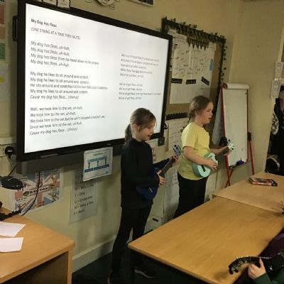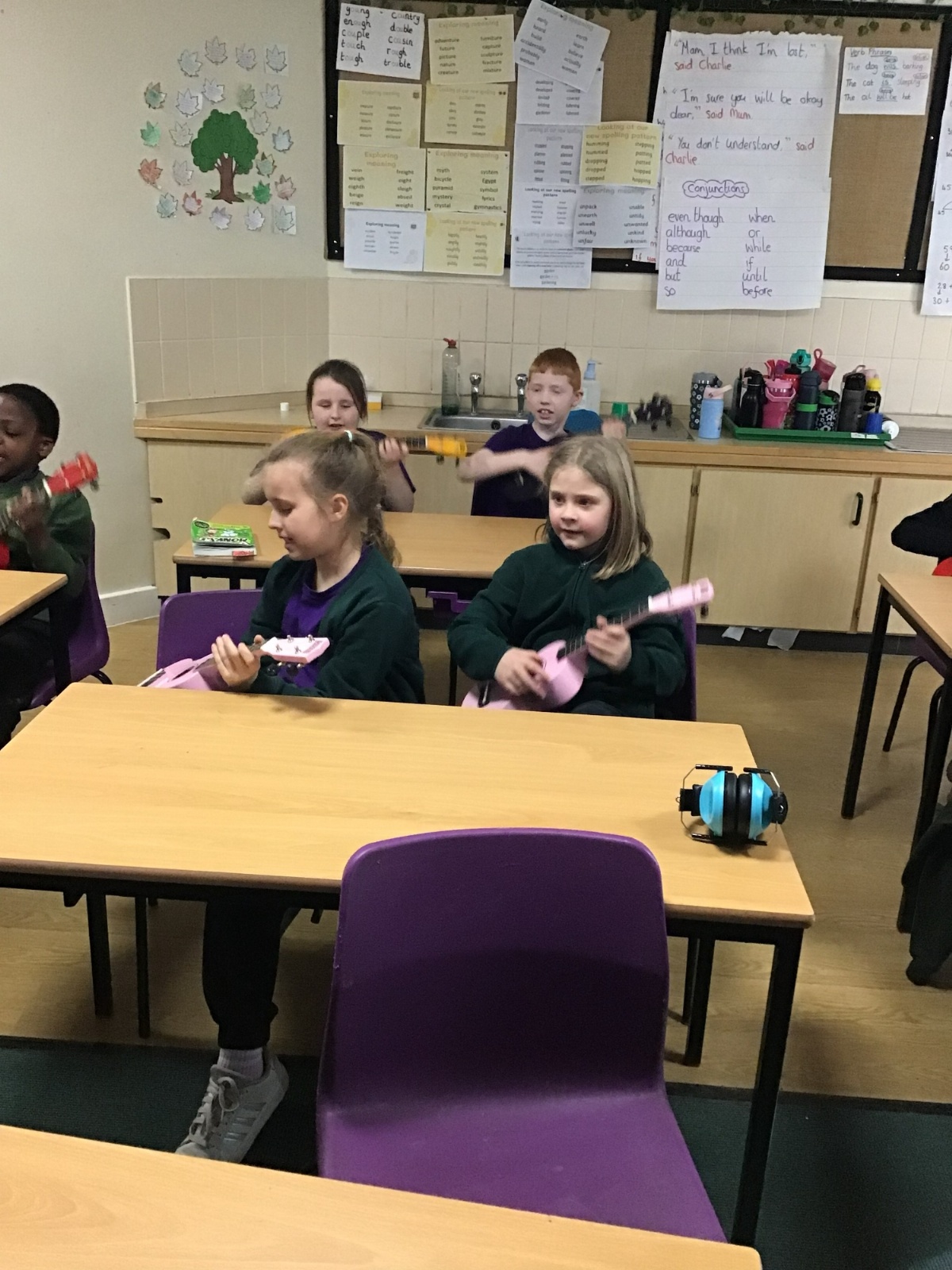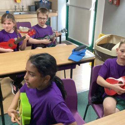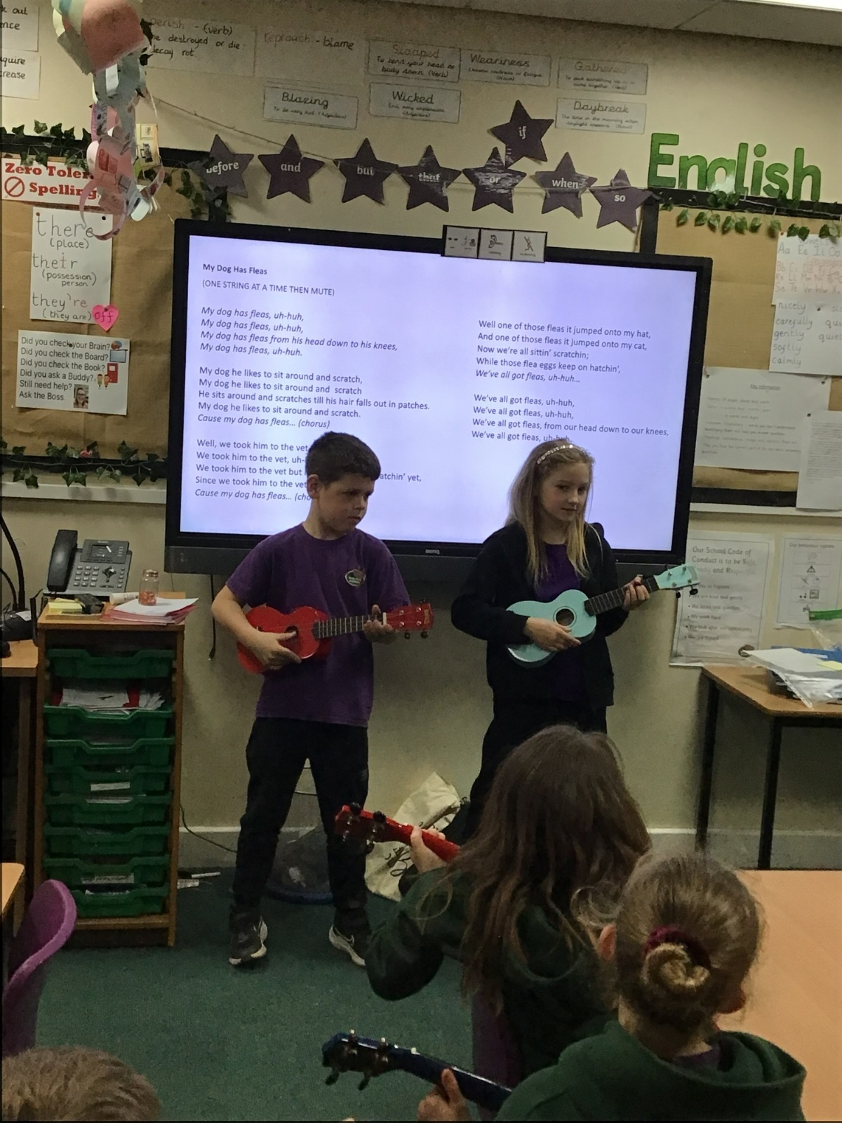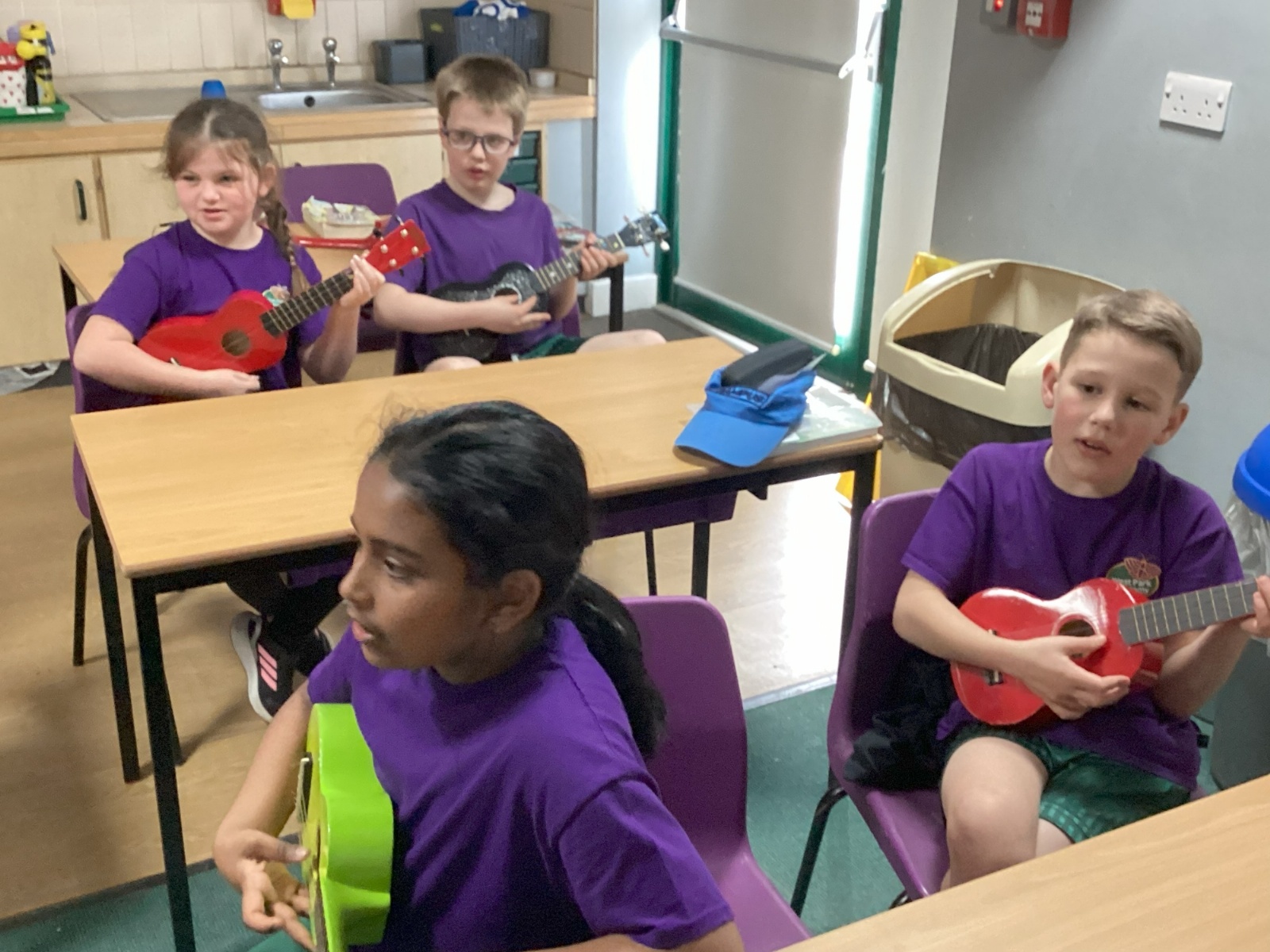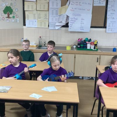 This term Year 3 have been learning to play the Ukulele. Mrs Guest from Durham Music service has been coming in once a week to teach the children. She has been very impressed with how much progress the children have made. They have learnt to play the chords C, F and Am and to play a variety of songs including Mama Mia and Hit the Road Jack. They also enjoyed signing as well as playing the ukulele.